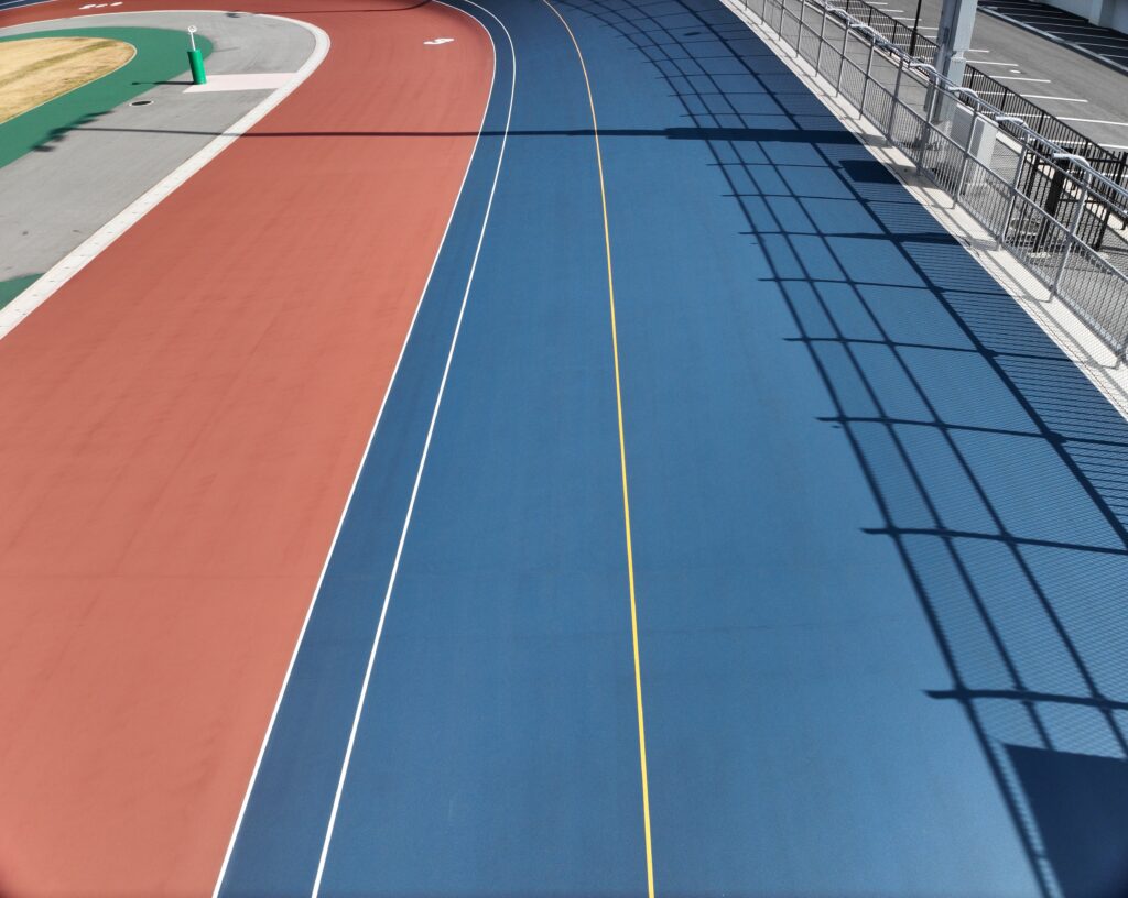 競輪場独特の走路を塗料を用いて、塗り分けています。